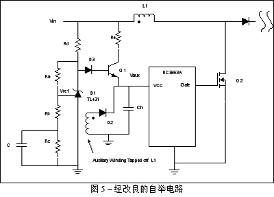 通过电阻器Rd的Ra以及二极管D1、D2,再加上晶体管Q1,它们构成了低功耗偏置电源。低功耗偏置电源根据设置可调节电压,使其高于PWM的关闭电压,又低于辅助绕组的额定电压(Vaux_nominal)。这就使晶体管Q1能作为二极管或电路发挥作用。如果PWM由辅助绕组供电,那么Vaux电压将反向偏置,关闭晶体管Q1而节约能量。如果由于能量不足Vaux电压下降,那么Q1就会变成正向偏置,以向PWM控制器提供必需的能量。