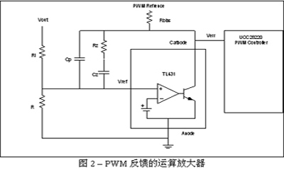 在设计包含PWM而不含电压放大器的电源设计时,系统设计人员可采用并联稳压器作为廉价的运算放大器。图2给出了这种应用的功能结构图。方程式1解释了这种补偿网络的小信号传输函数的数学原理。